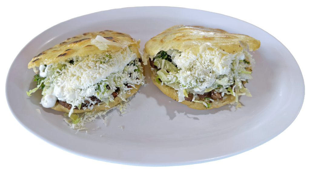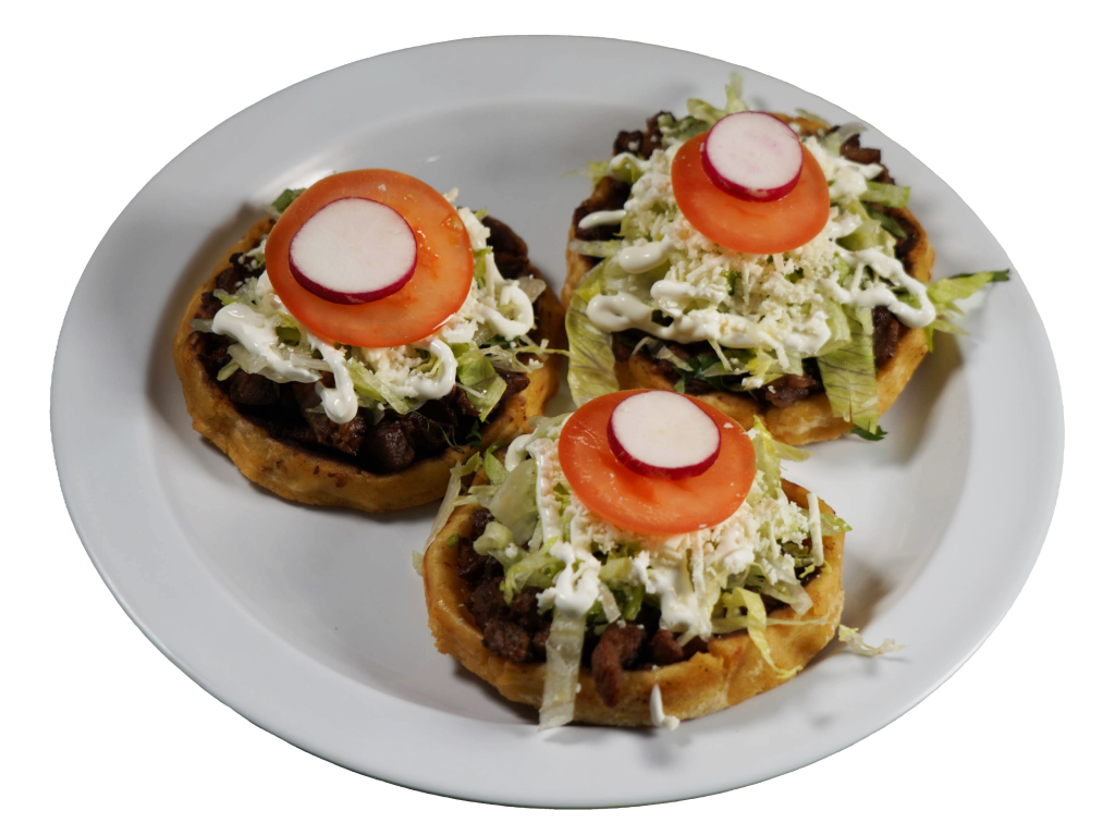 Handmade corn dough served with refried beans, lettuce, tomato, Mexican cheese, radish, onion, cilantro, and sour cream. With your choice of meat.