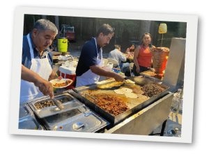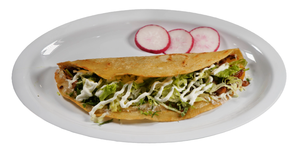 A handmade corn tortilla folded in half filled with Oaxaca Mexican cheese with lettuce, onions, cilantro, sour cream, and radish on the side. With your choice of meat.