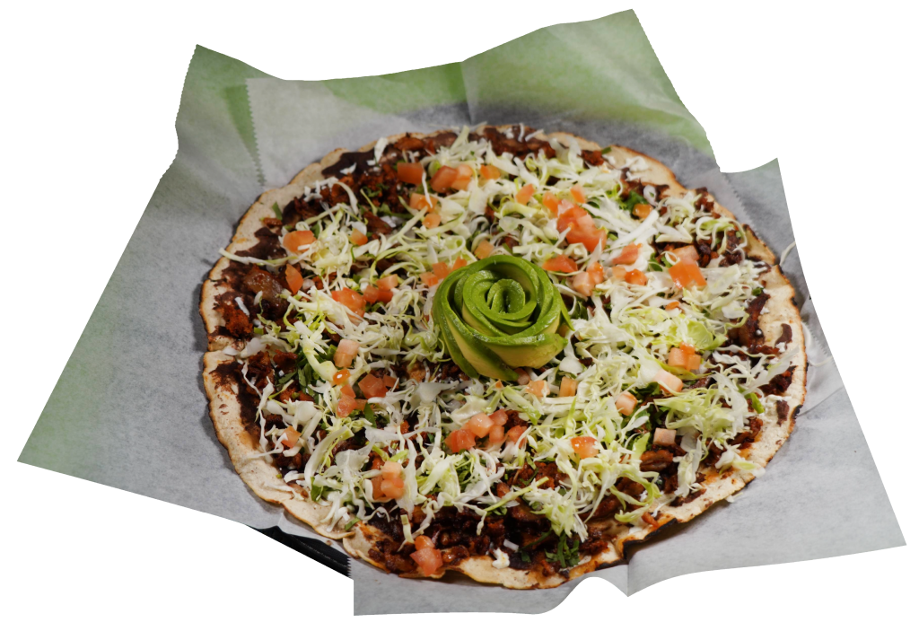 A handmade big tortilla (pizza style) served with lettuce, tomatoes, Mexican cheese, sour cream, onion, cilantro, avocado. With your choice of meat.