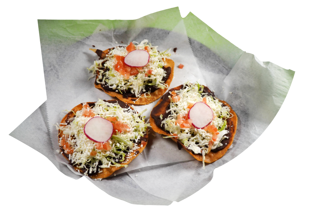 Fried tortillas with or without meat served with refried beans, lettuce, tomatoes, radish, Mexican cheese, and sour cream.