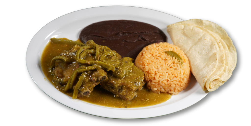 Fried corn tortillas with your choice of green o red sauce with two eggs on top; served with sour cream, Mexican cheese, sliced avocado, onions, and refried beans.